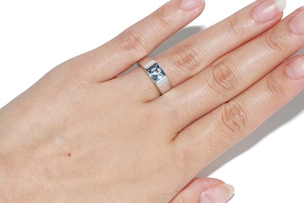 透明感のあるアクアマリンが付いているタンクリング。シンプルながらもオシャレなデザインです。
