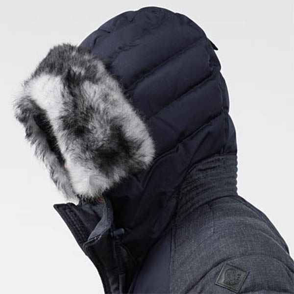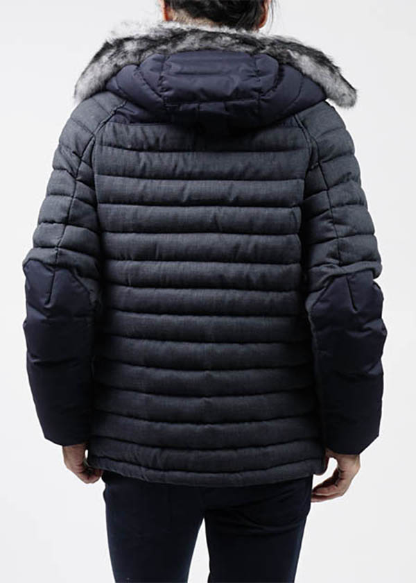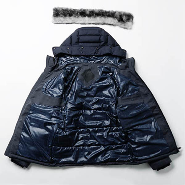 上品な右綾生地とキメ細やかな平織地を巧みに切り替えています。スーツ生地のようなサラリとしたスムーズな生地感で、フォーマルな印象になっているのもポイントです。フードに付いているファーはラビット。毛足が短く、かえってボリューミーなところがゴージャスなアクセントになっています。中綿にはもちろんお馴染みの高級ダウンを使用。キャトルフロコンを取得した厳選、かつ最上レベルの中綿で厳しい寒さからカバーしてくれます。